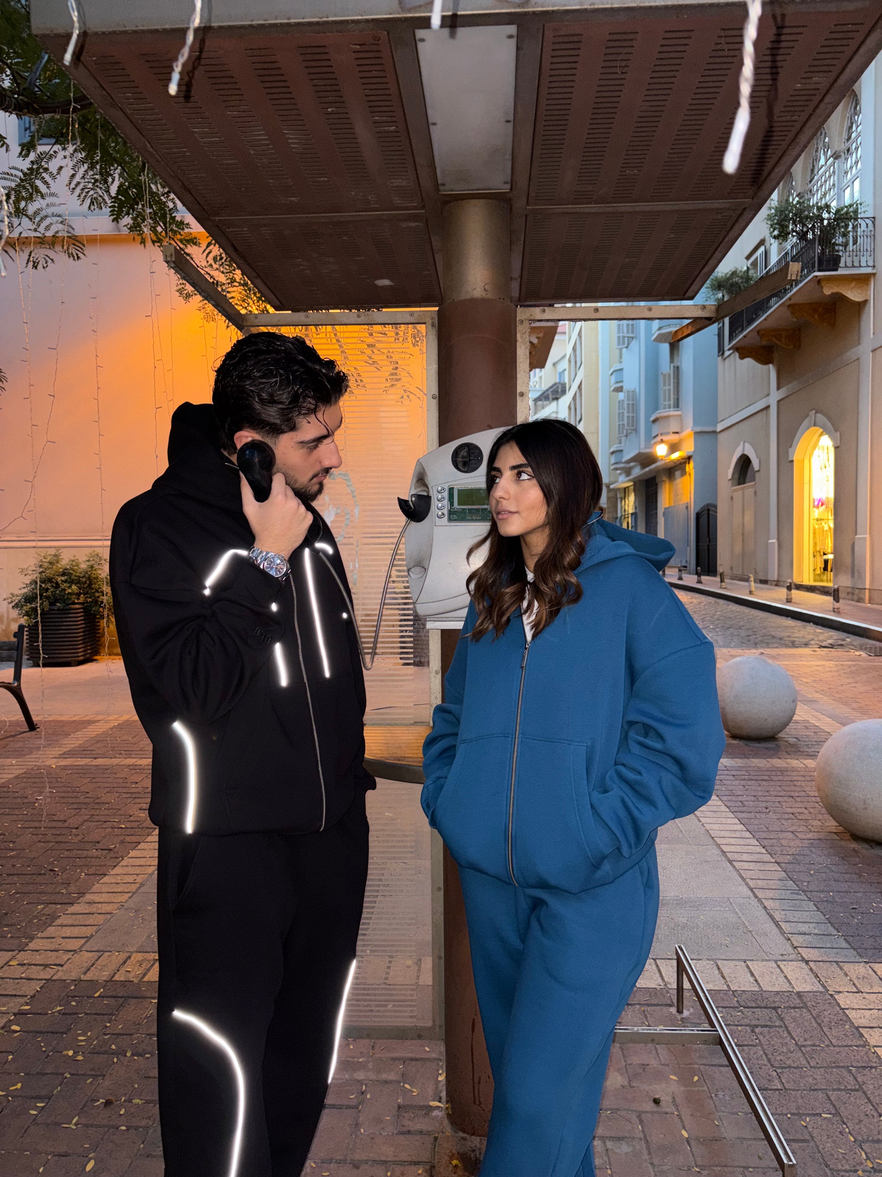 Our black reflective set shines with purpose, built for those who move with confidence even in the darkest moments — while the petroleum blue set carries warmth, comfort, and the calm strength of home.